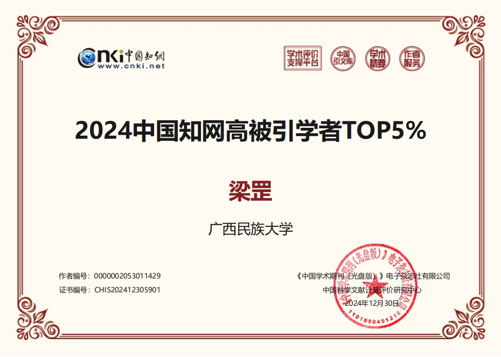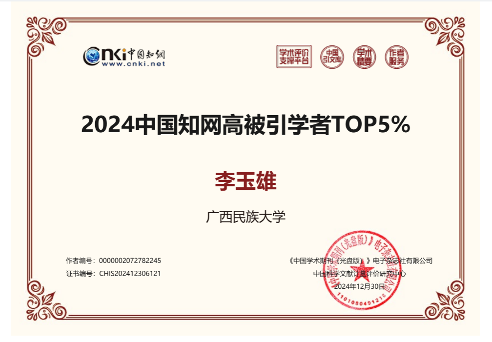 中国知网下属的中国科学文献计量评价研究中心(简称“知网评价中心”)于2024年首次开展学者学术影响力客观评价,经过定量数据统计、遴选方案评审、学科专家调研等前期筹备工作,现已形成“2024中国知网高被引学者”名单,其中,我院院长李玉雄教授和校团委书记、betway必威西汉姆联官网教师梁罡教授成功入选名单,位列“中国知网高被引学者Top5%”。