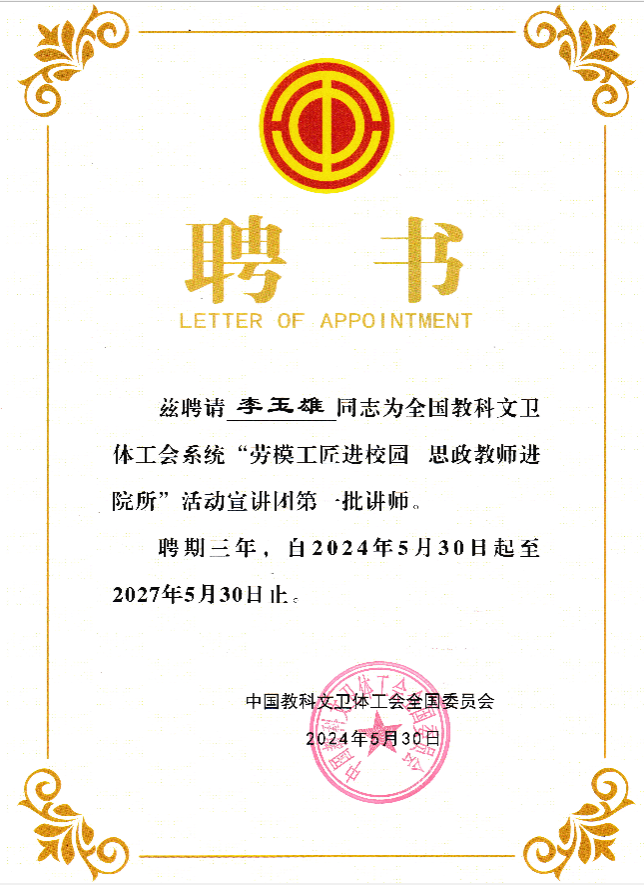 为贯彻落实习近平总书记关于大力弘扬劳模精神、劳动精神、工匠精神和加强新时代学校思政课建设的重要指示,充分发挥劳模工匠和思政教师在教育学生、引领职工中的模范表率作用,近日,中国教科文卫体工会全国委员会发文公布全国教科文卫体工会系统“劳模工匠进校园 思政教师进院所”活动宣讲团第一批讲师名单。广西民族大学betway必威西汉姆联官网院长李玉雄教授获聘为宣讲团讲师。