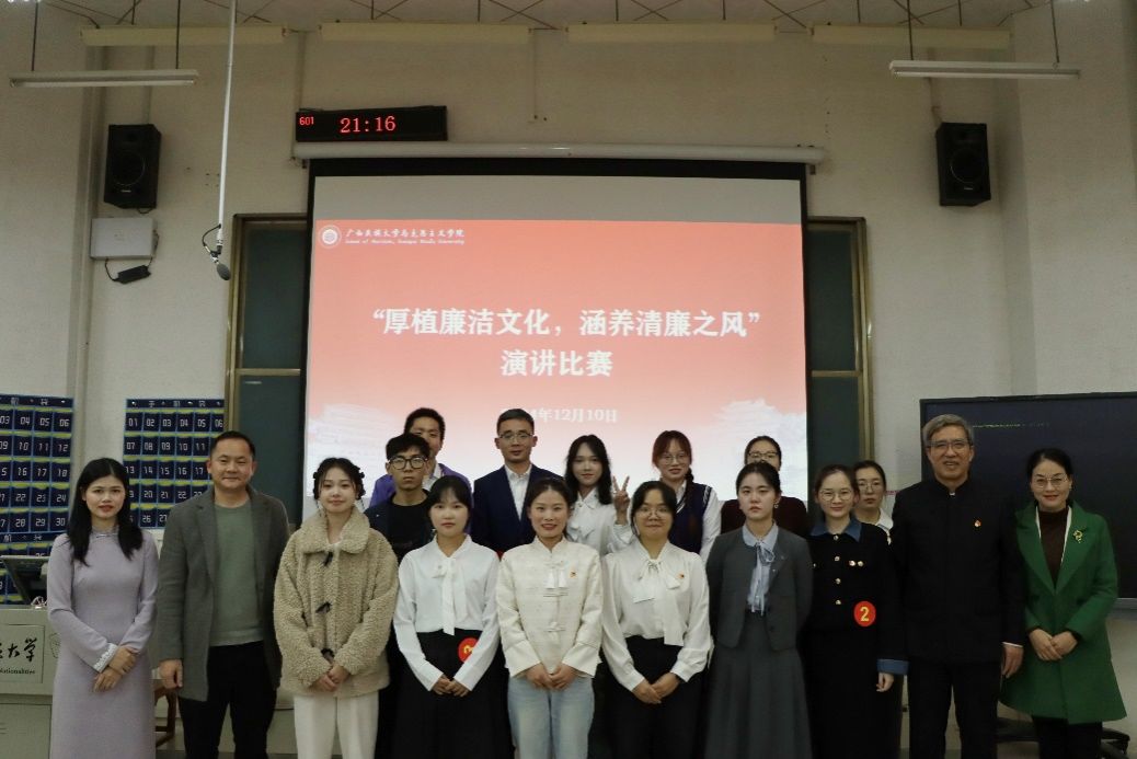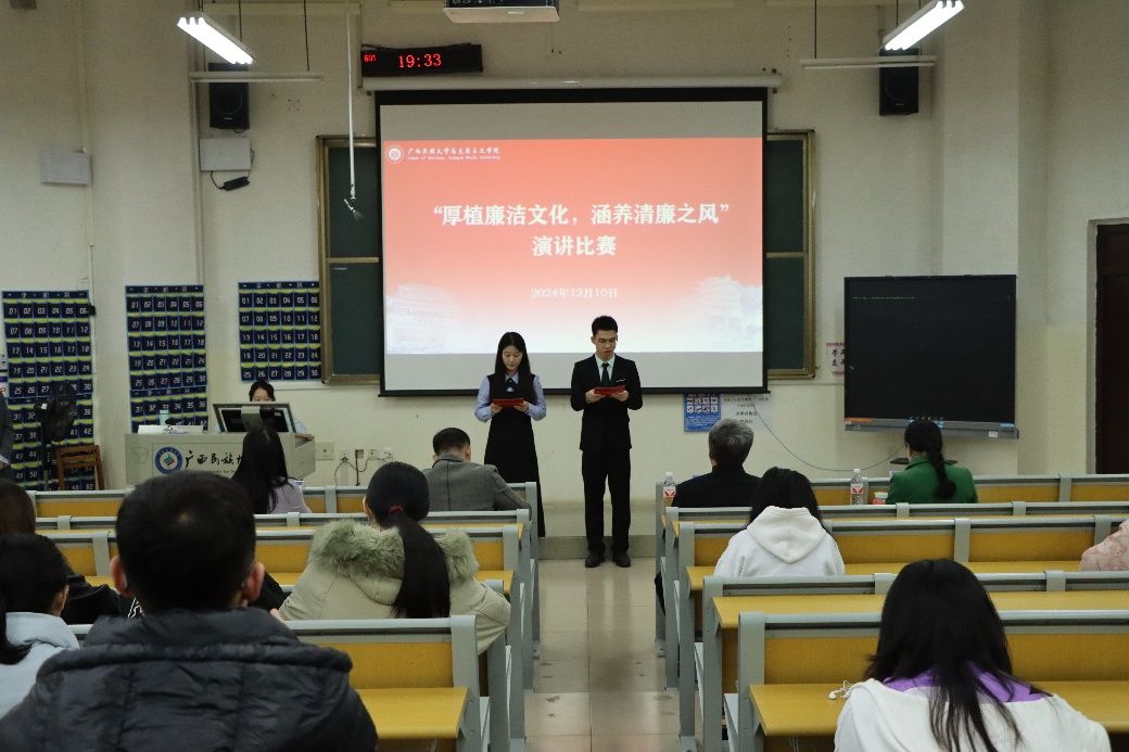 2024年12月10日晚,betway必威西汉姆联官网第三届“厚植廉洁文化,涵养清廉之风”主题演讲比赛在学友楼601室举办。本次比赛由学校纪委叶华龙,学院教师刘国彬、周园、韦雯担任评委。