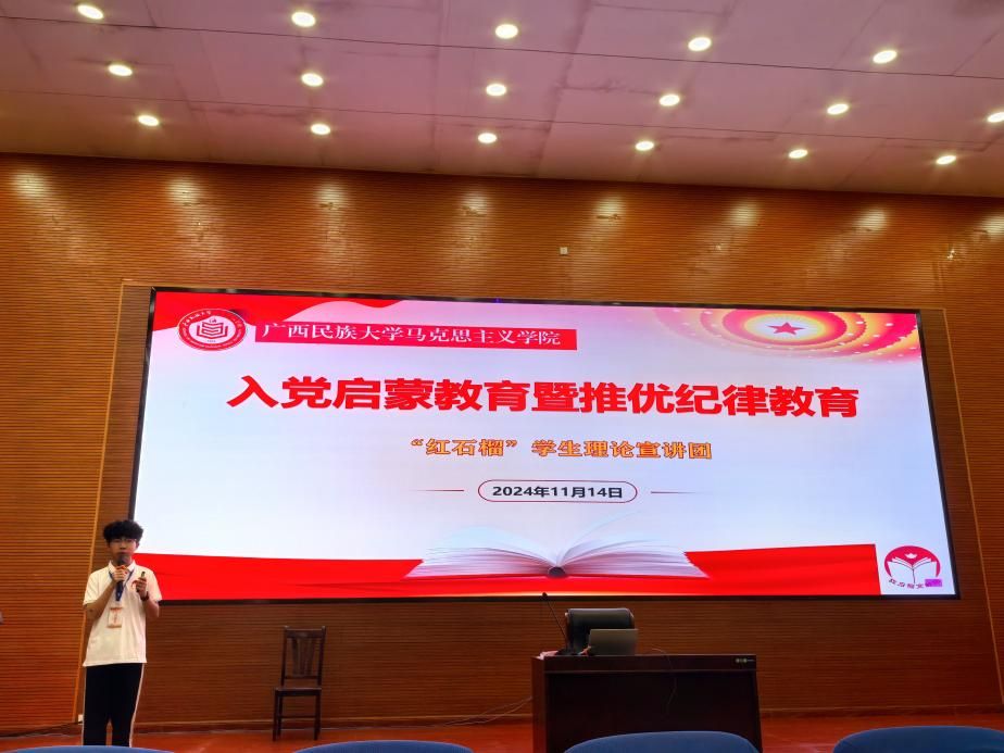 为深入学习党的二十大精神,贯彻落实《广西民族大学开展“传承红色基因、学思践悟中国共产党人精神谱系”宣传教育实施方案》的要求。广西民族大学“红石榴”学生理论宣讲团聚焦“传承红色基因、学思践悟中国共产党人精神谱系”这一主题,在我校3个校区开展理论宣讲。
