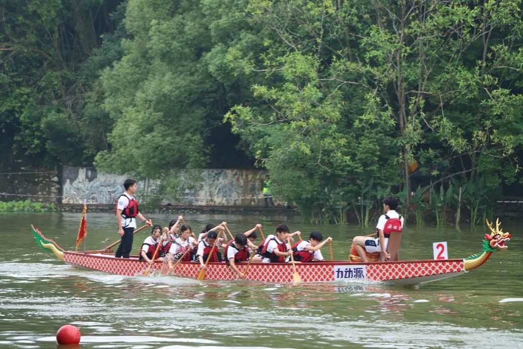 校园龙舟赛作为我校传统品牌活动至今已历经五届。裁判一声令下,划龙舟比赛正式开始。船上的同学们个个精神抖擞,伴着铿锵的鼓点,整齐划一地挥动船桨,奋力向终点冲刺。岸边的加油声、欢呼声此起彼伏,场面壮观,热闹非凡。