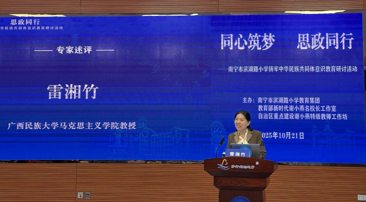 为深入贯彻落实《关于加强学校铸牢中华民族共同体意识教育的指导意见》要求,促进大中小幼各学段思政教育协同发展,10月21日上午,由南宁市委统战部、市民宗委、市教育局,青秀区委统战部(民宗局)、教育局指导的“铸牢中华民族共同体意识”专题教育研讨活动,在南宁市滨湖路小学教育集团滨湖校区举行。我院学科教学(思政)方向负责人雷湘竹教授应邀参会,马克思主义理论、学科教学(思政)专业研究生代表参会。
