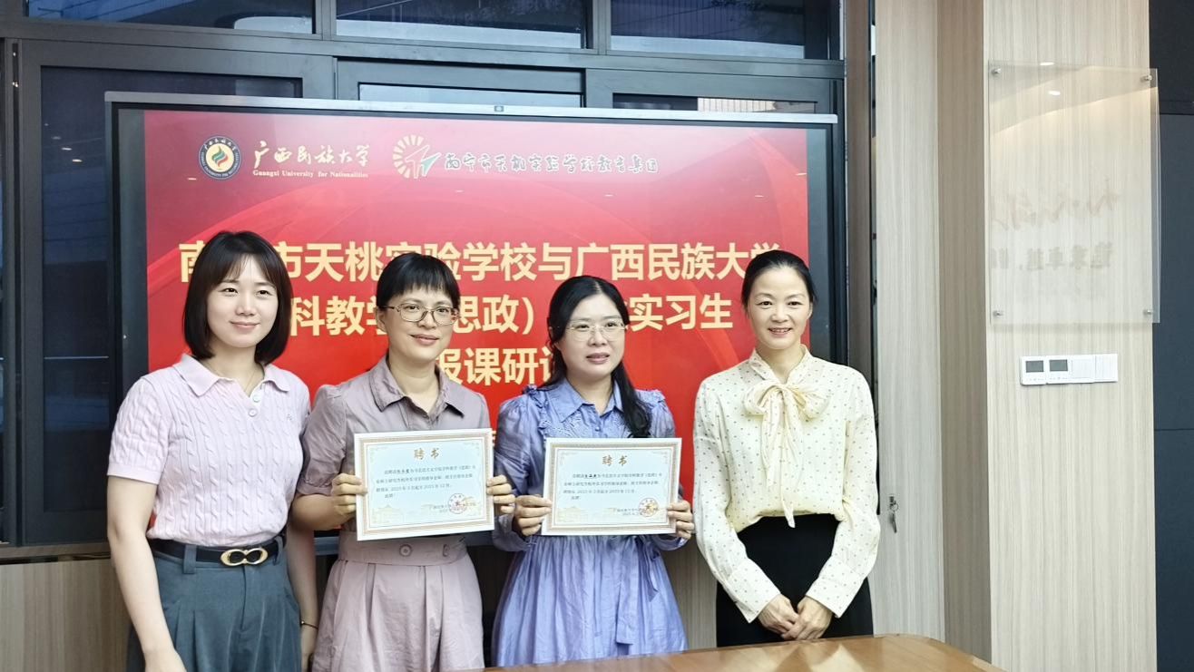 对此,天桃实验学校表示,欢迎更多高校研究生来校实习,希望通过与高校的深度合作,进一步推动中学思政教育的发展。并在研讨会结束后,带队教师团代表我院向南宁市天桃实验学校的陈永坚、易海燕两位教师颁发指导聘书。