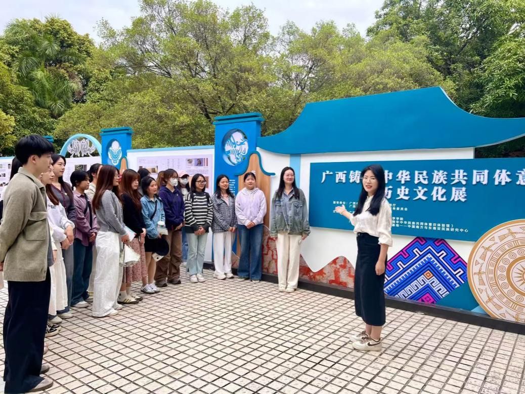 史梦娜带领支部成员参观“广西铸牢中华民族共同体意识历史文化展”,并围绕“共书悠久历史”“共创灿烂文化”“共育伟大民族精神”三个部分,向大家介绍了广西各民族为中华民族和中华文明的形成和发展作出的重要贡献。